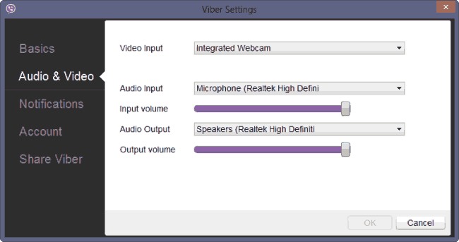 The Viber PC app also provides some basic settings like it allows you to change the input and output volume.